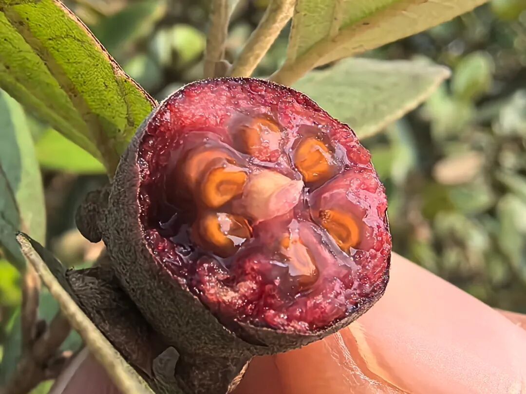 仔细端详,每棵树上都硕果累累,果实呈现出青、红、紫等不同颜色,恰似一个个缩小版的酒杯。山稔子果中有芯,形似一条小虫,芯外布满籽,味道格外甜美。尤其是成熟至紫色时,口感软糯、甘甜多汁,吃过后,舌头和牙齿都会被染成紫黑色。